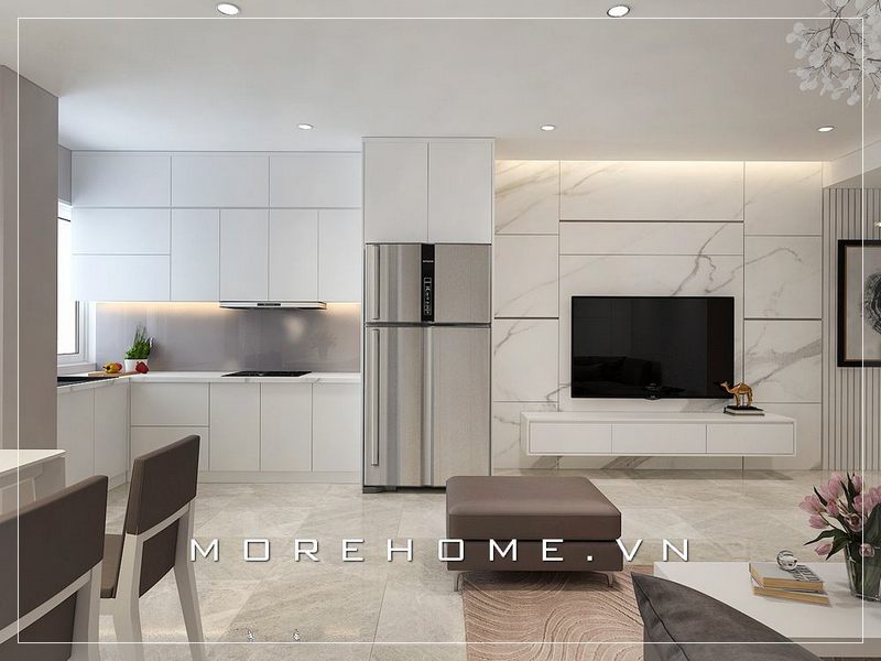 Thiết kế nội thất phòng bếp chung cư với tone màu trắng hiện đại tạo nên không gian thoáng mát và sạch sẽ hơn