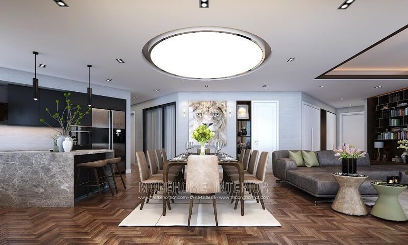 Mẫu bàn ăn gỗ hiện đại, bàn ăn mặt đá màu trắng ấn tượng kết hợp với ghế gỗ bọc da màu ghi tạo nên sự hài hòa cho phòng ăn chung cư