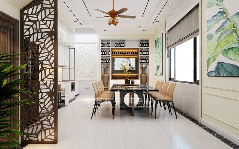Ấn tượng với bộ bàn ăn gỗ cao cấp với những đường vân tinh tế, đường nét đơn giản cuốn hút tạo điểm nhấn nổi bật cho căn phòng