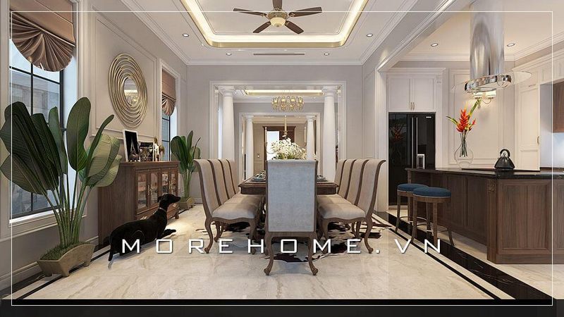 Gam màu trung tính hiện là gam màu được đông đảo quý khách hàng lựa chọn. Gam màu trung tính giúp phòng ăn toát lên được vẻ thanh thoát, sang trọng trong thiết kế không gian căn phòng.
