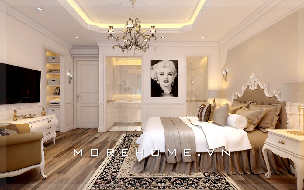 Mẫu giường ngủ biệt thự cao cấp phong cách tân cổ điển đầy ấn tượng, đầu giường bọc da cách điệu tạo điểm nhấn cuốn hút mọi ánh nhìn