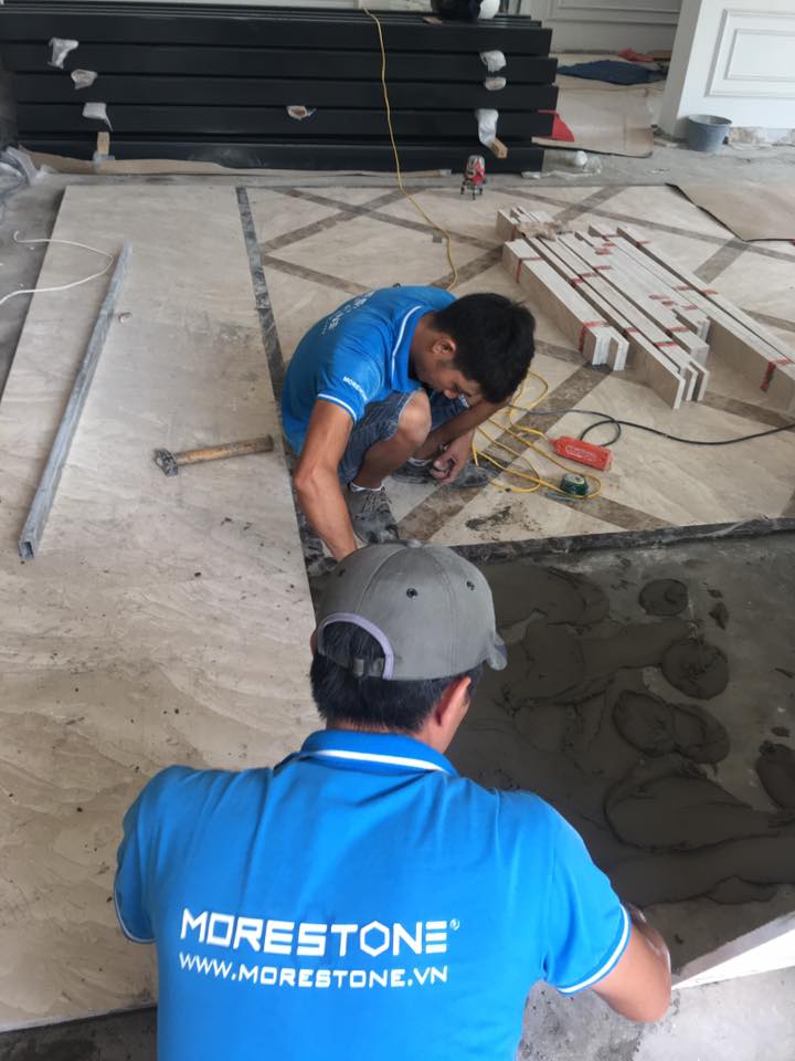 Quy trình thợ Morestone tỉ mĩ thi công lắp đặt sản phẩm đá.