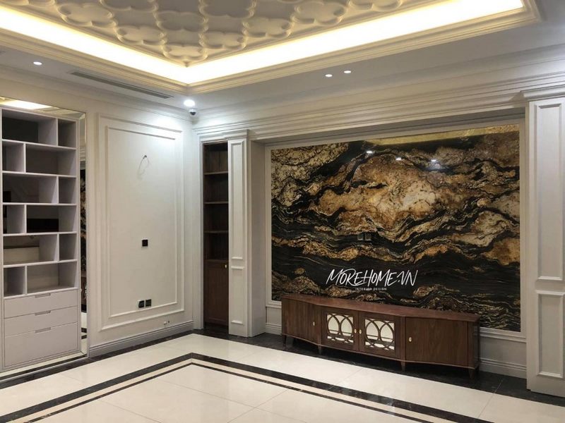 Ngoài ra, các hệ thống phào chỉ đóng vai trò trang trí, thường xuất hiện trong các ngôi nhà mang hơi hướng cổ điển, tân cổ điển cũng là một ứng dụng cho đá tự nhiên tại phòng khách.
