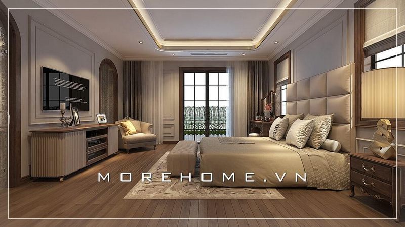 . Thiết kế nội thất phòng ngủ Master tân cổ điển được đặc trưng bởi sự cầu kỳ tập trung vào đường nét đầu giường với phong cách trang trí hoàng gia.