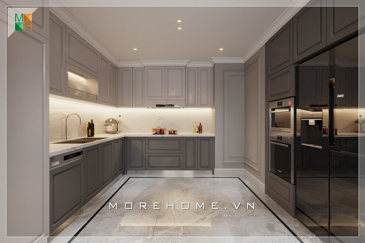 Ấn tượng với mẫu thiết kế tủ bếp đẹp có chút tân cổ điển từ những cái chạm khắc phào nổi của mặt ngoài tủ, nhưng cũng rất hiện đại sang trọng.