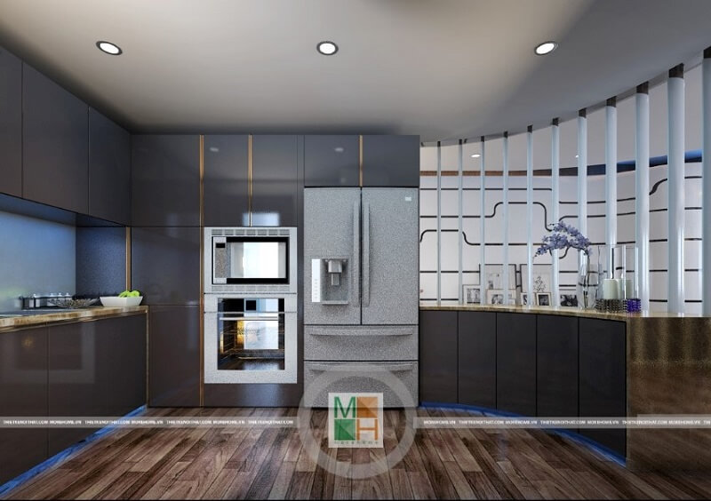 Mẫu thiết kế phòng bếp chung cư cao cấp với tông màu ghi xám chủ đạo vừa đảm bảo tính thẩm mỹ, hiện đại vừa giữ nguyên được ngôn ngữ thiết kế sang trọng và đơn giản của tổng thể thiết kế căn nhà.